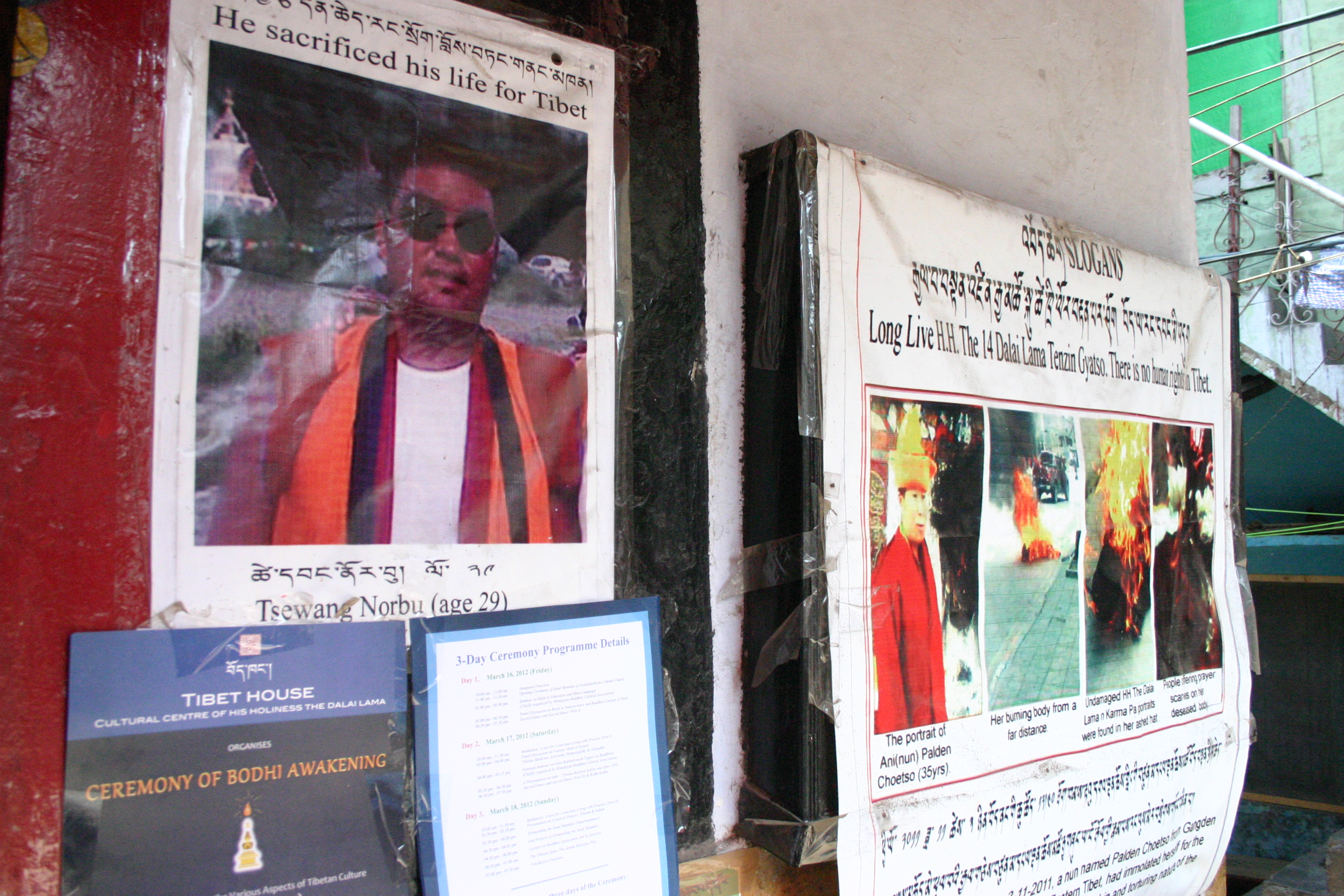 Photo Caption for featured image: Before Majnu Ka Tila was shut down, monks and other Tibetans go about their lives under posters documenting Tibetans’ self-immolation.